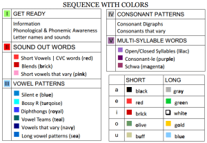 The sequence followed by different methods of teaching reading can vary. The Phonics Pow Toolkit is designed to help teachers teach, and students learn with a sensible sequence that builds on skills as they are learned. It is organized in five sections, with most sections having three parts (except the vowel pattern section, which has six). Color coding often provides clues, like the color RED (a CVC word with a short vowel) for the SOUND OUT WORDS section. As much as possible, one syllable words that include only patterns that have been learned are used until the final section. Strategies provide clues but there are many exceptions.