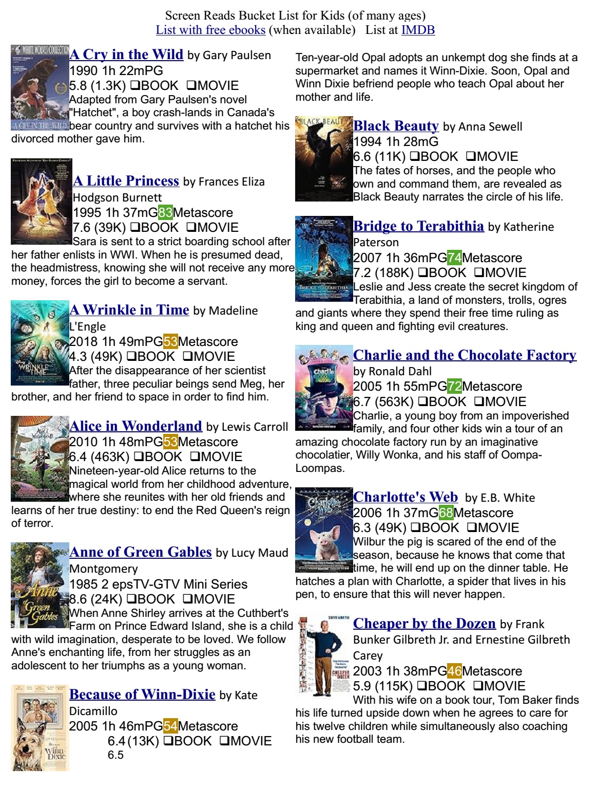 Free ebooks. There are free ebooks available for many classic titles that are also movies. Look for these at the Kids Classic Screen Reads list, which is alphabetical by author. If a free ebook is not available, check your local library. The Kids Classic Screen Reads at IMDB provides short summaries and can be sorted alphabetically by title and many other ways. The 40 titles currently on the Kids Screen Reads Bucket List are a starting point. There are even more book to film adaptations!