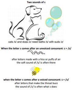 The letter s can make different sounds, depending on whether it follows a voiced or unvoiced consonant. After an unvoiced consonant, often s = /s/. After a voiced consonant, often s = /z/.